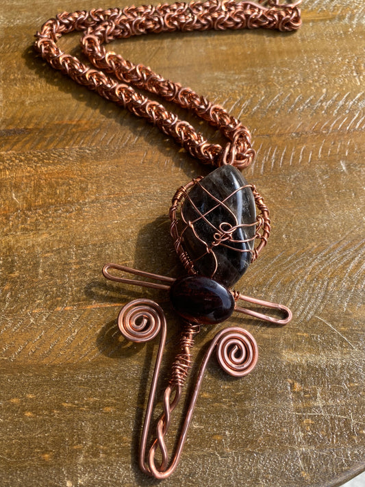 “CRIMSON ACTIVATION” COPPER+SMOKEY QUARTZ+RED TIGERS EYE BYZANTINE NECKLACE