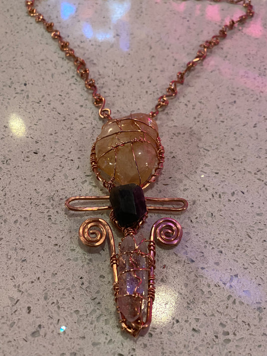 COPPER+CITRINE+LABRADORITE+CLEAR QUARTZ ANKH NECKLACE
