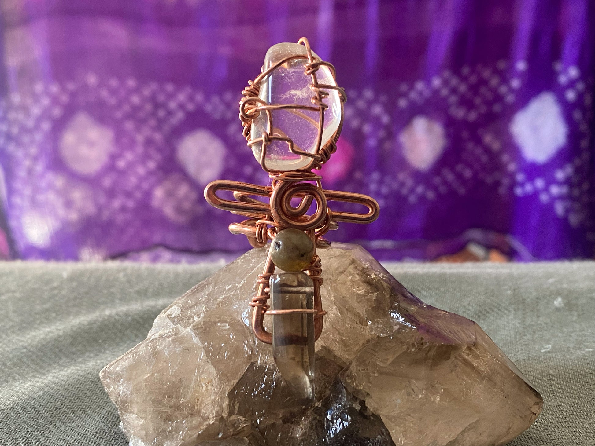 COPPER+QUARTZ+LABRADORITE+SMOKEY QUARTZ ANKH RING