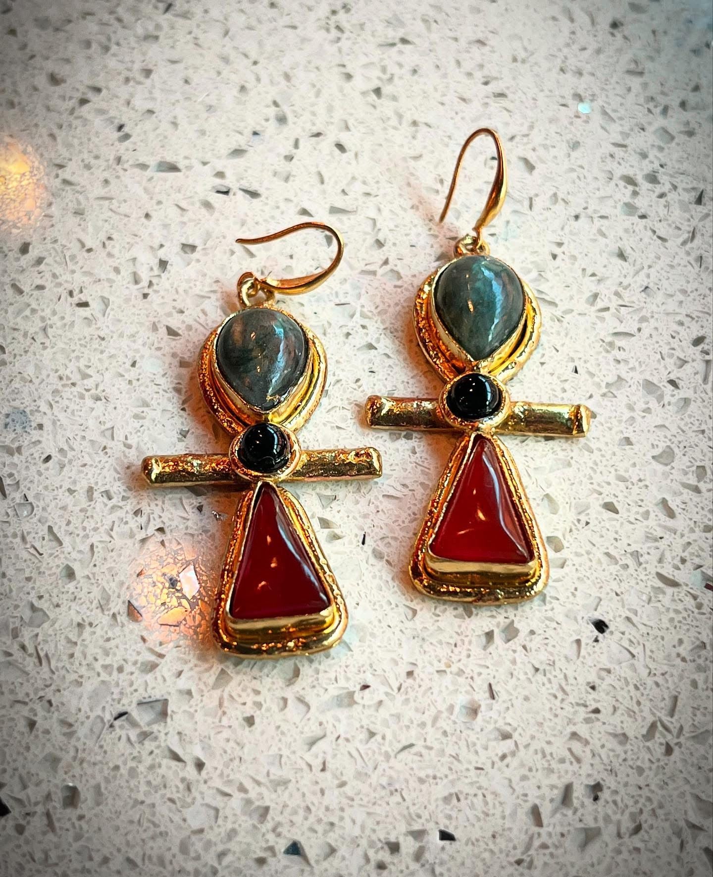 LABRADORITE+ONYX+CARNELIAN ANKH EARRINGS IN BRASS